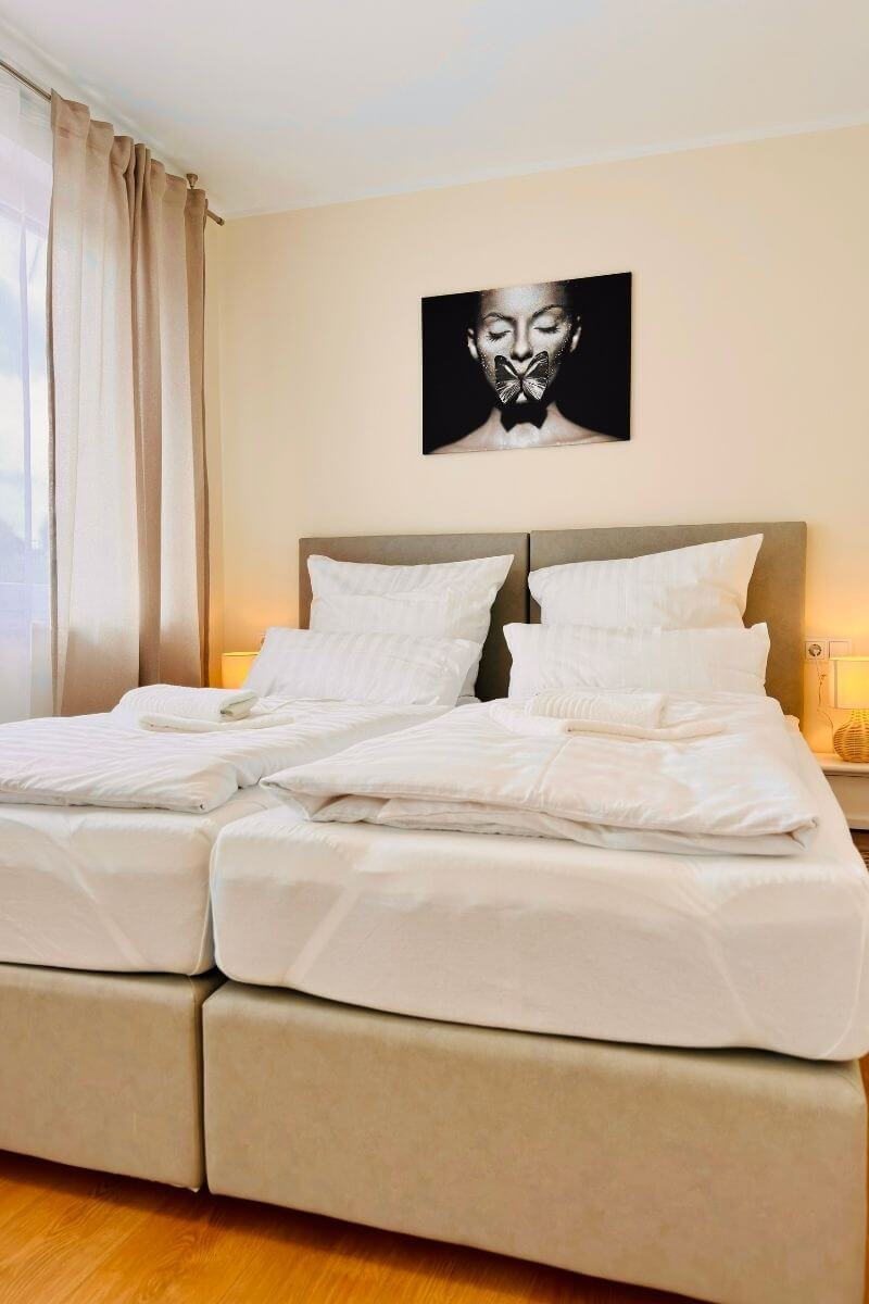 Die Ferienwohnung in Bad Oeynhausen nahe Bali Therme – RG Living verfügt über drei Schlafzimmer mit insgesamt sechs komfortablen Einzelbetten. Die großzügige Raumaufteilung bietet viel Platz für Gruppen und Arbeitsteams.