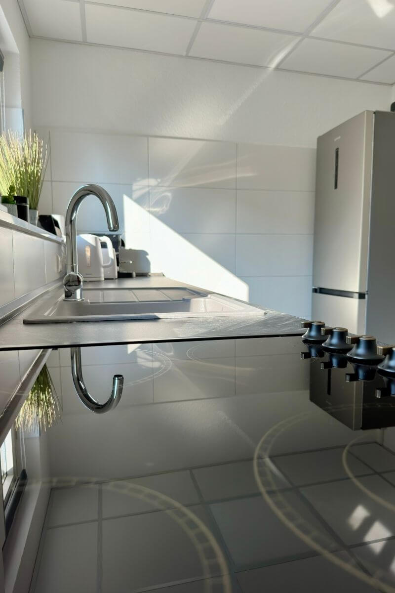 Gäste von RG Living profitieren von einer modernen Vollausstattung: Die Wohnung verfügt über eine Küche mit Cerankochfeld, Nespresso-Maschine und Kühlschrank inklusive Gefrierfach. Zur Unterhaltung und für das Home-Office stehen kostenloses WLAN sowie ein Smart-TV zur Verfügung. Ein modernes Badezimmer mit Dusche und ein separates WC sorgen für zusätzlichen Komfort bei Vollbelegung.