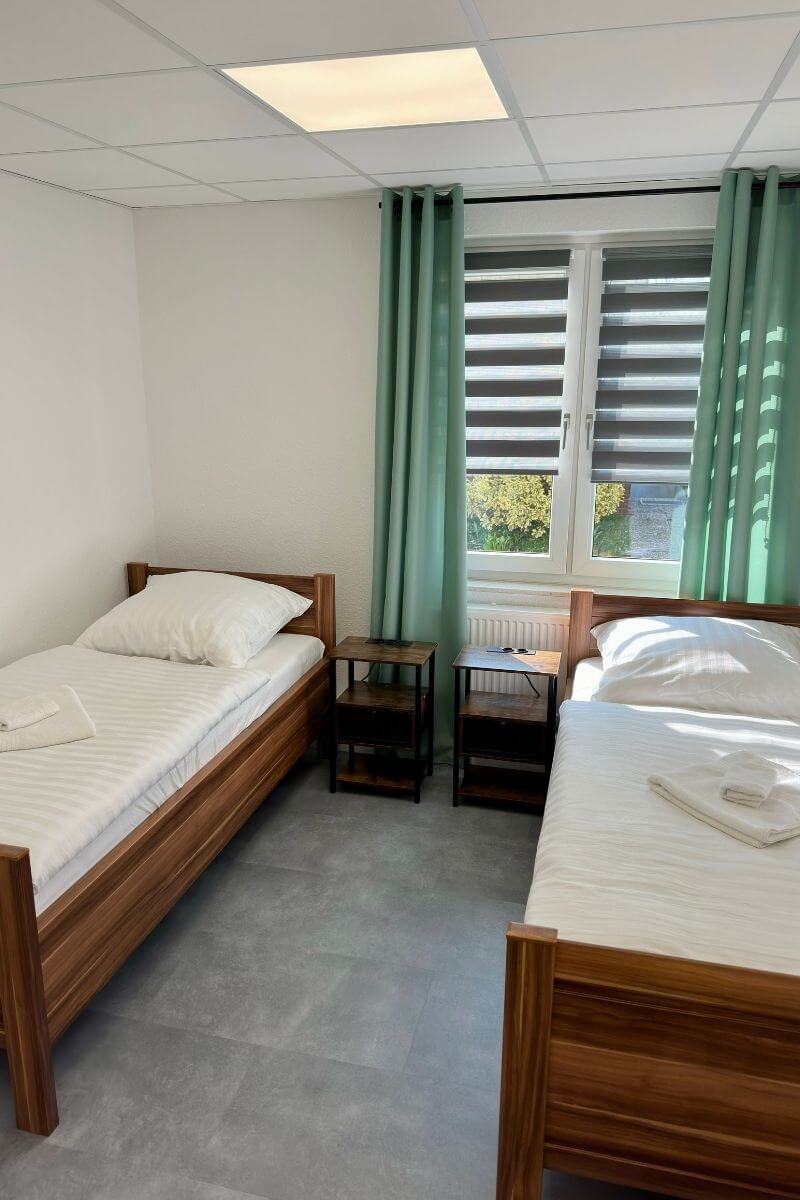 Die drei Schlafzimmer mit insgesamt sieben Einzelbetten bieten ausreichend Platz für Monteure, Arbeitsteams oder Familien. Alle Zimmer sind hell, funktional und bequem eingerichtet.